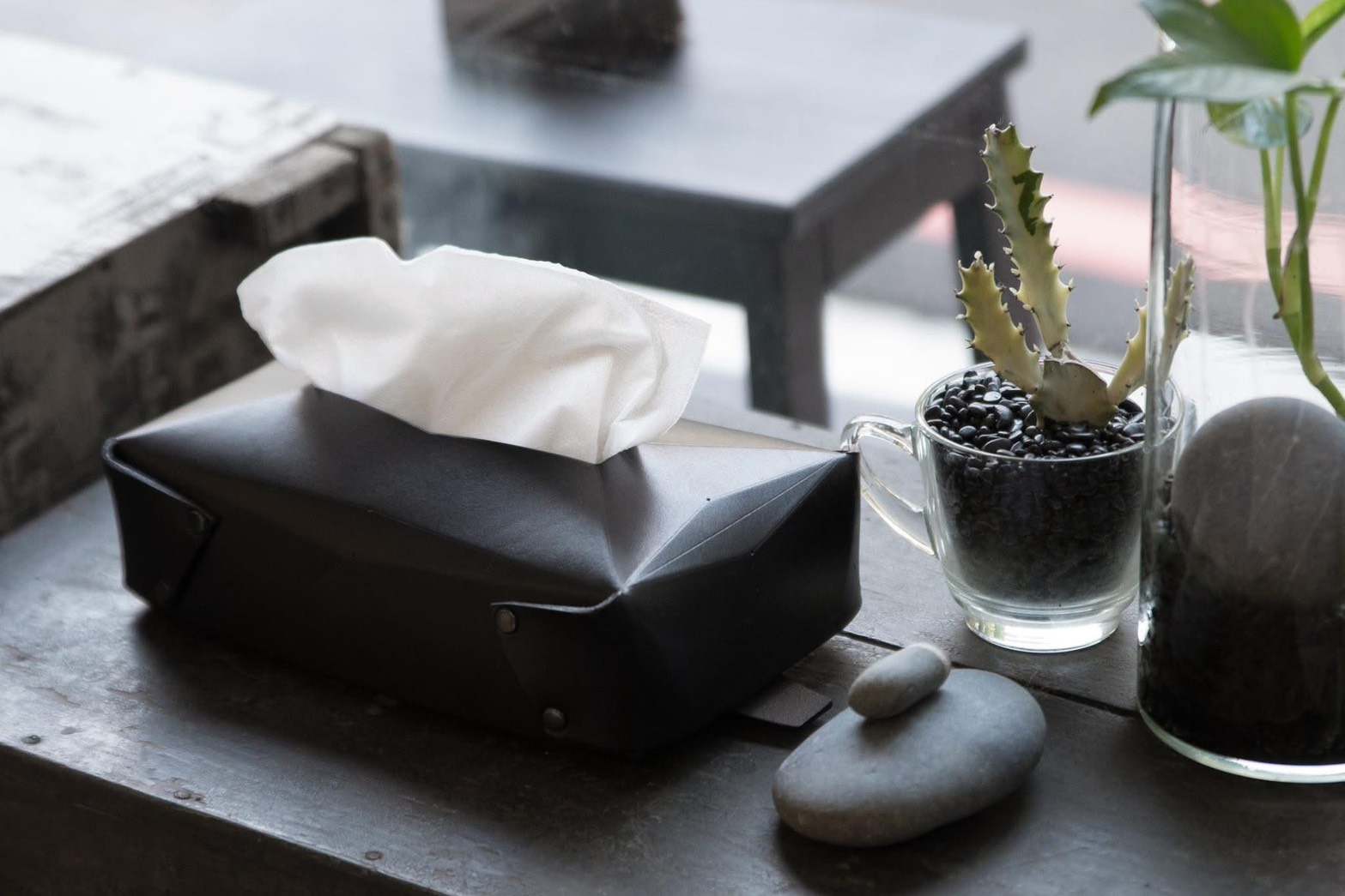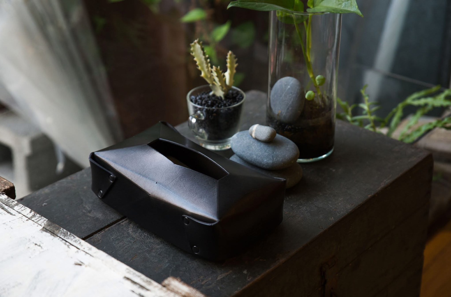 ● 幾何切面與皮革結構完美融合。